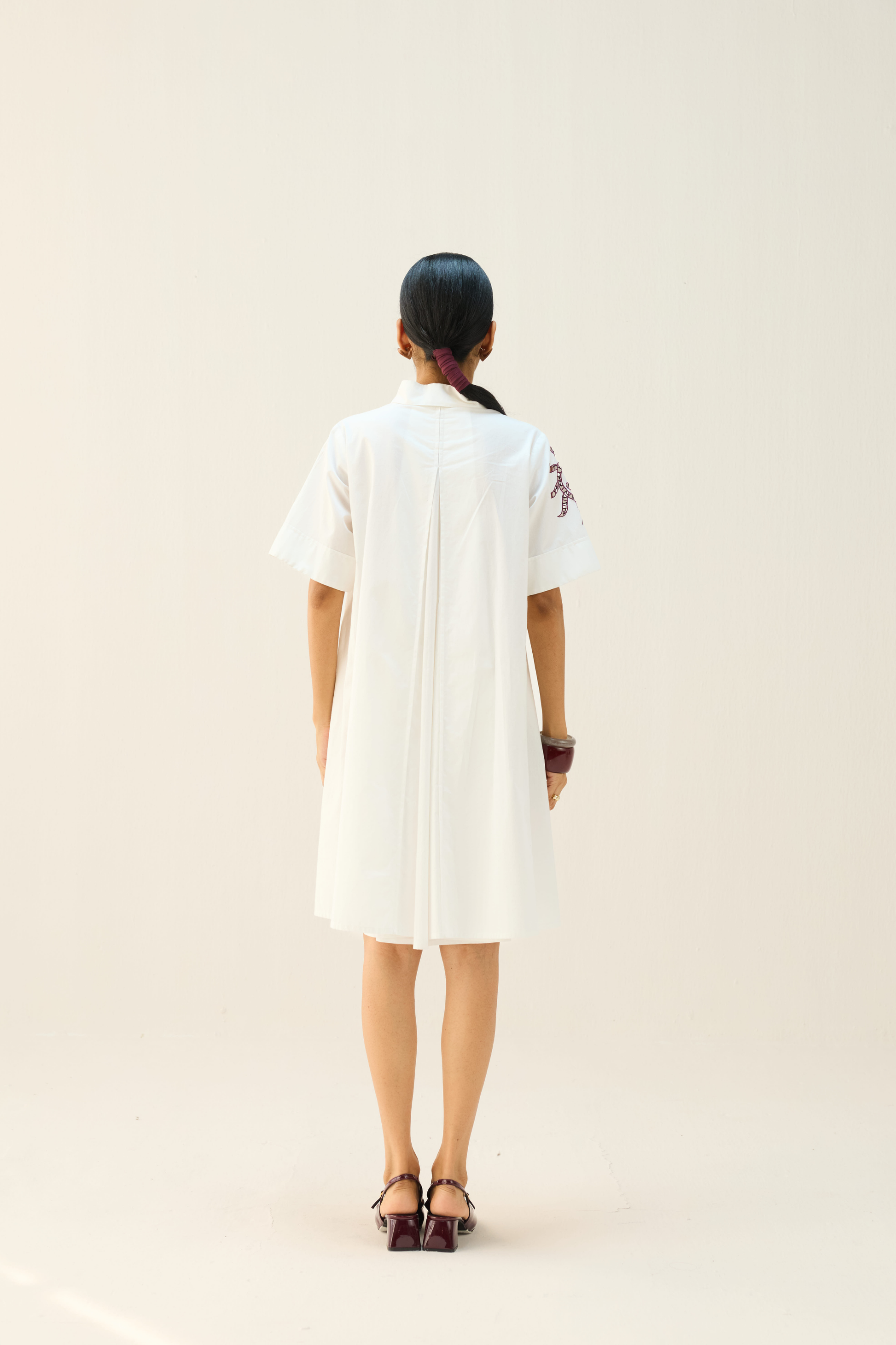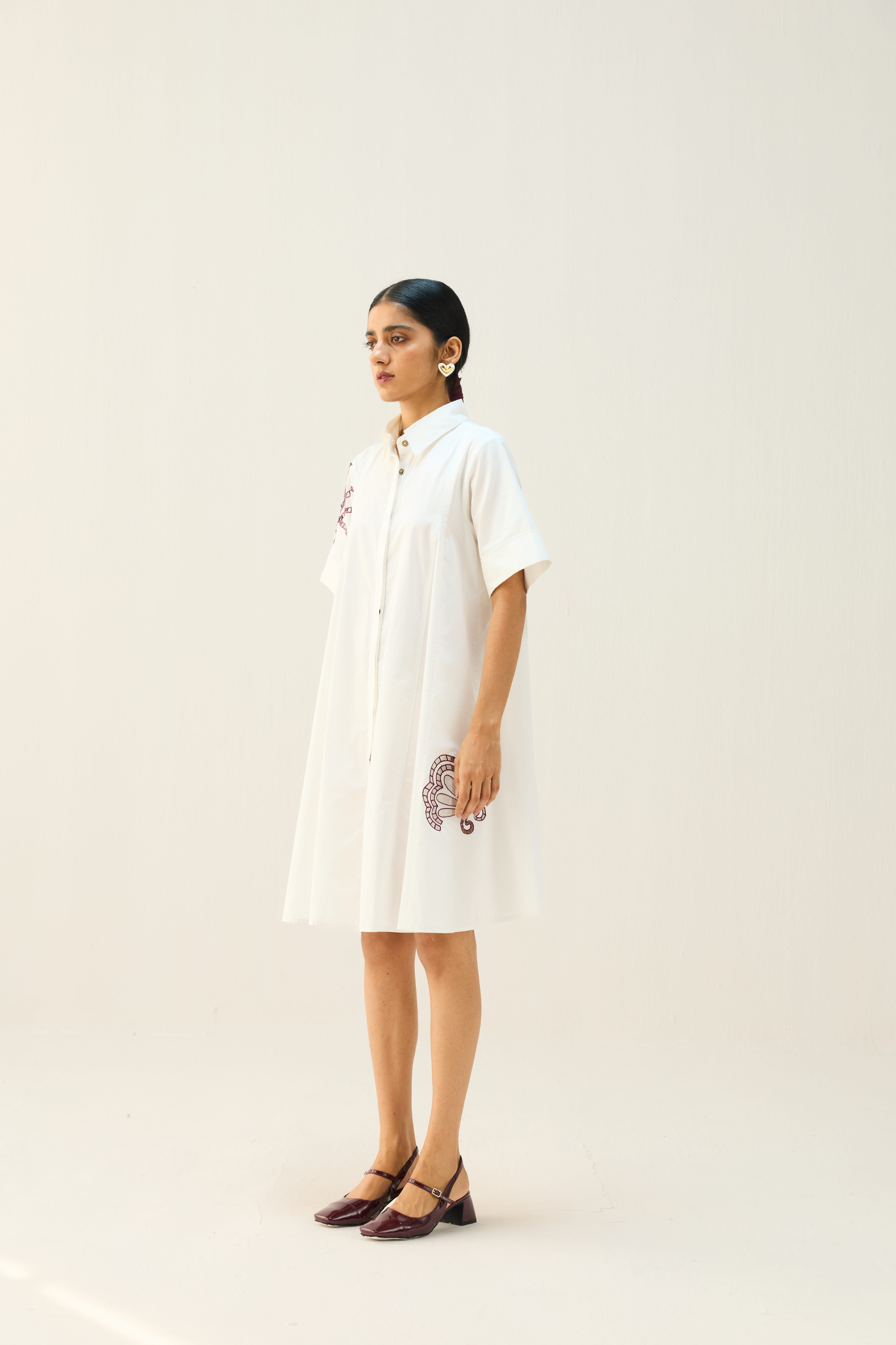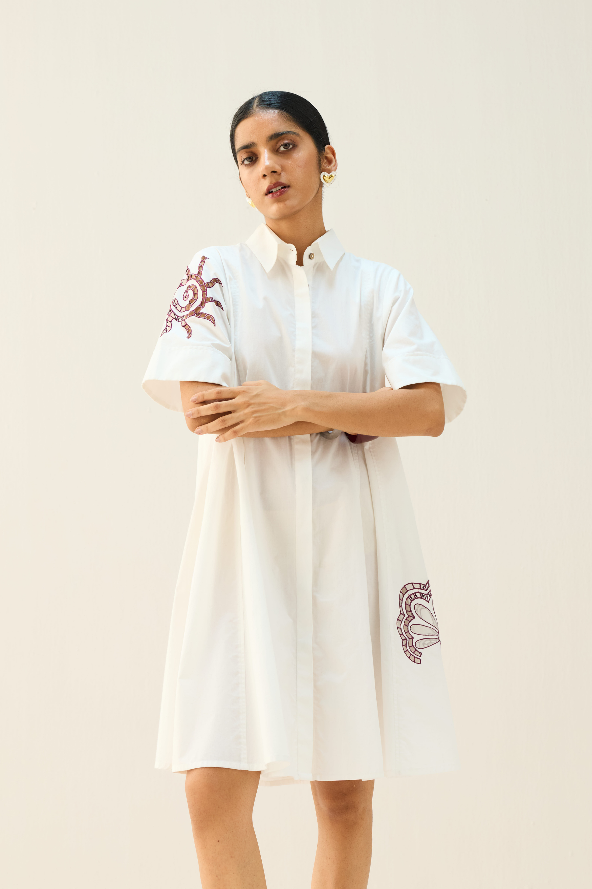 Relaxed fit, half sleeve, collared, a-line, midi shirt dress that buttons in the front, crafted in organic cotton poplin fabric, machine embroidered with sun cut-work motifs.