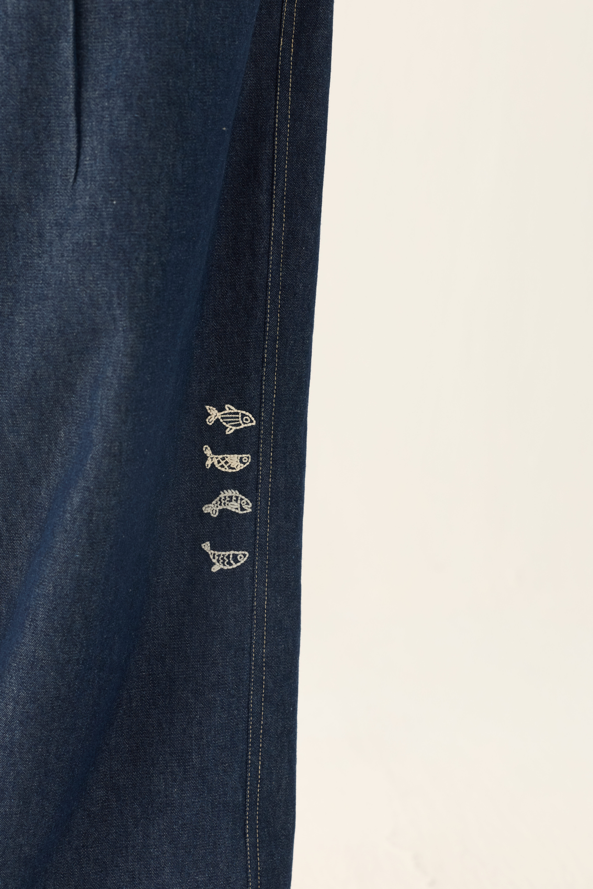 Fitted, wide-leg denim jeans that buttons at the waist and comes with a fabric belt, crafted in sustainable organic cotton denim fabric, hand embroidered with shore-inspired motifs.
