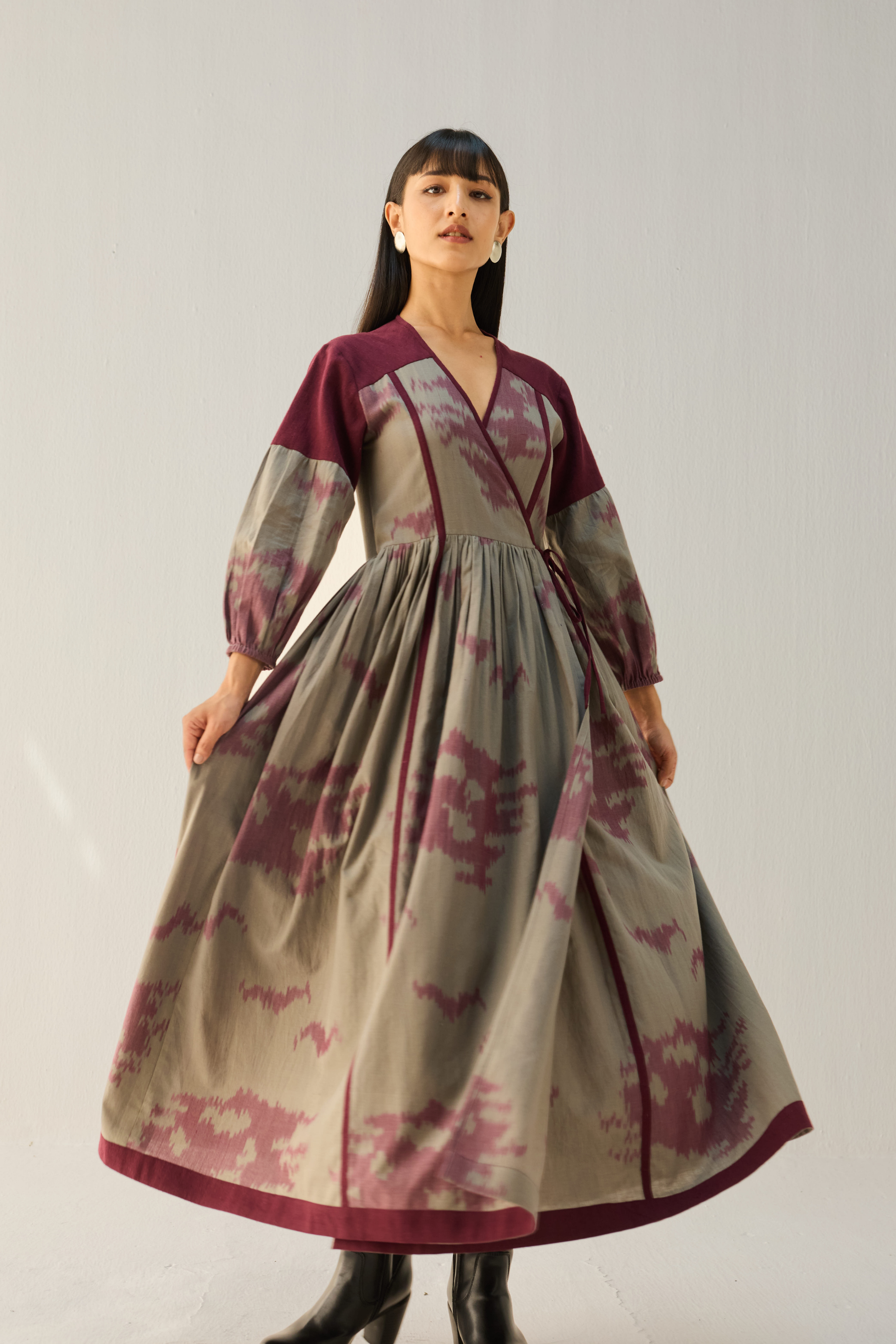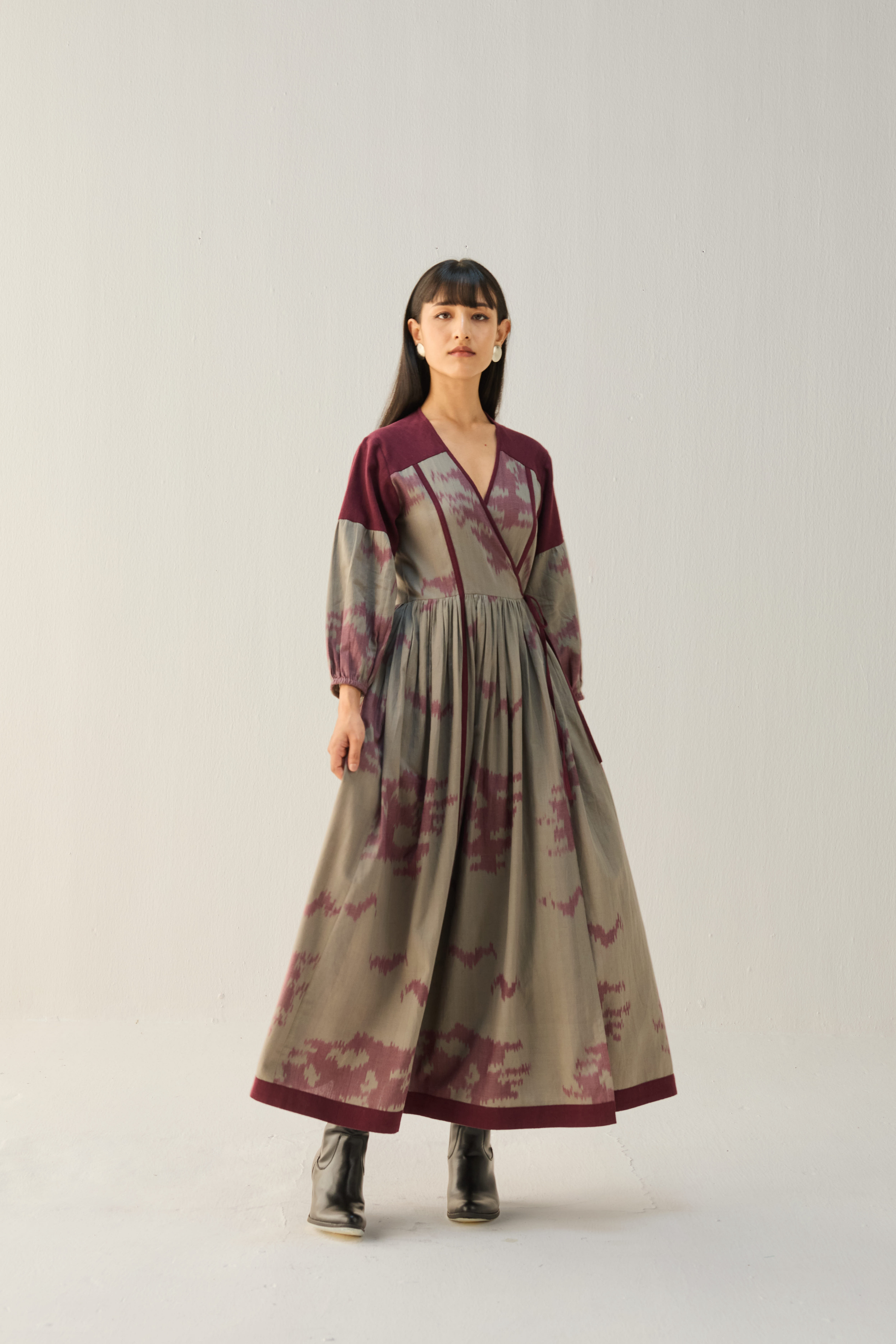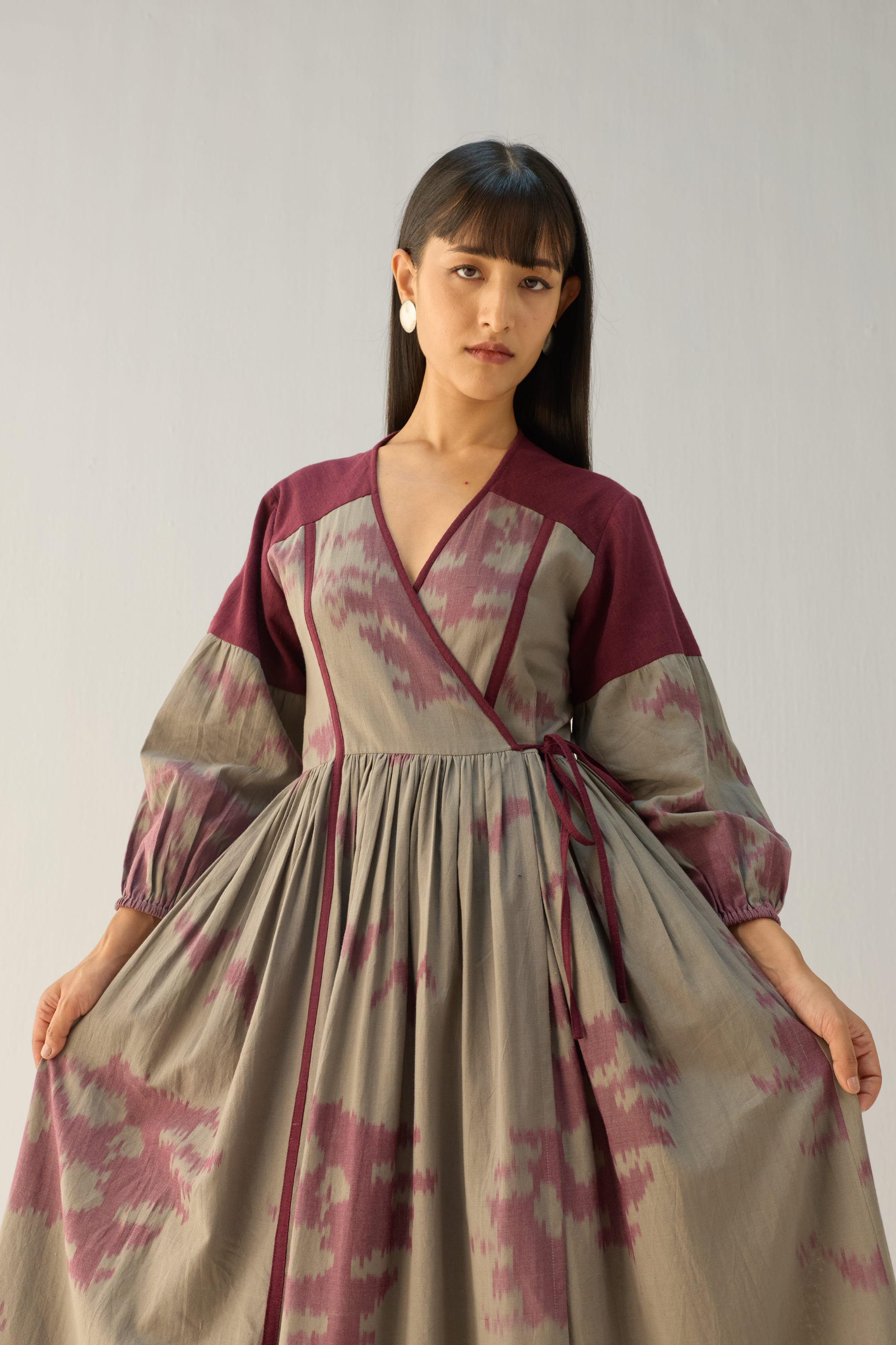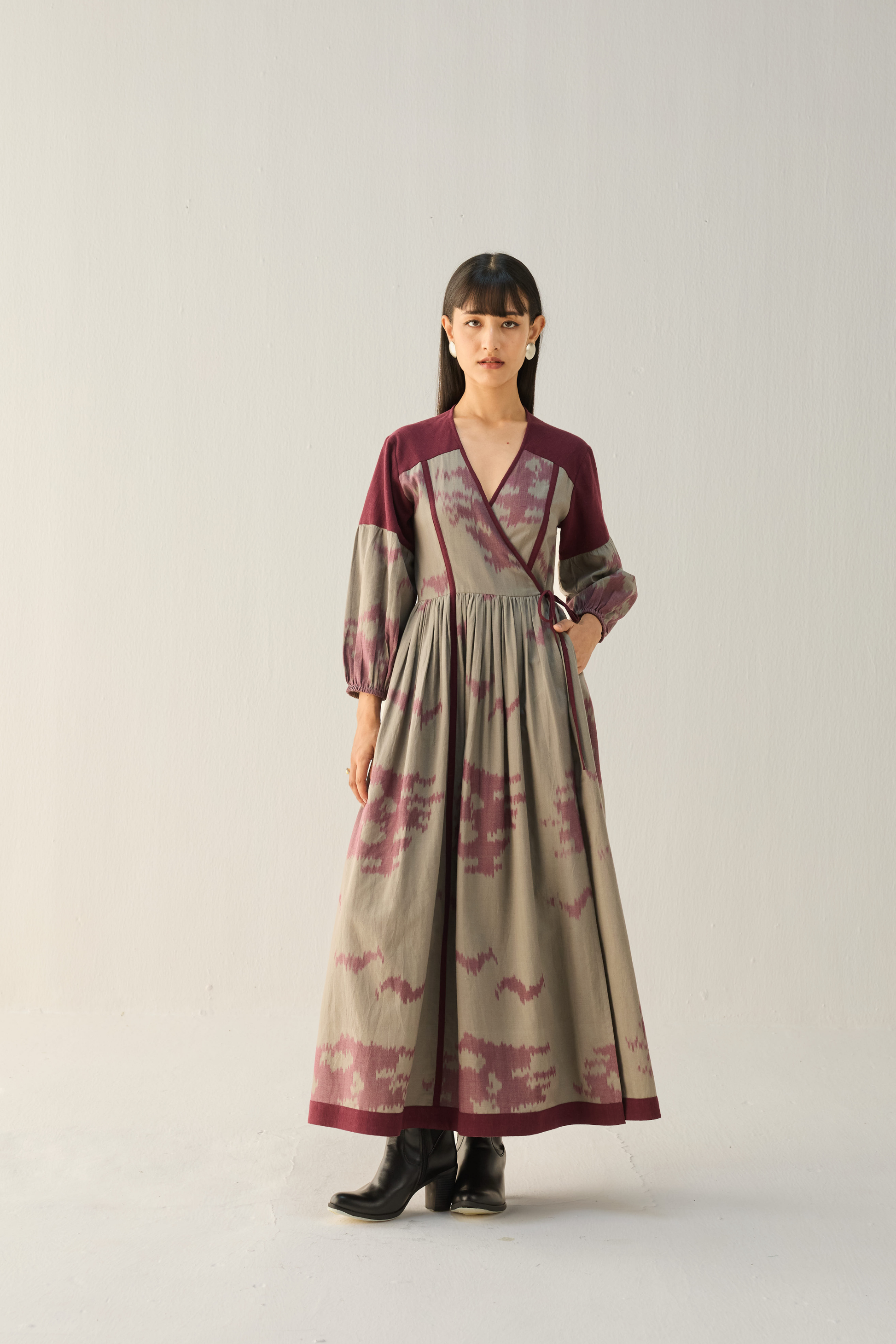 Relaxed fit, full puff sleeve, maxi wrap dress that ties at the waist, crafted in an ikat fabric, where the yarns are resist-dyed with azo-free dyes then handwoven to create its pattern.