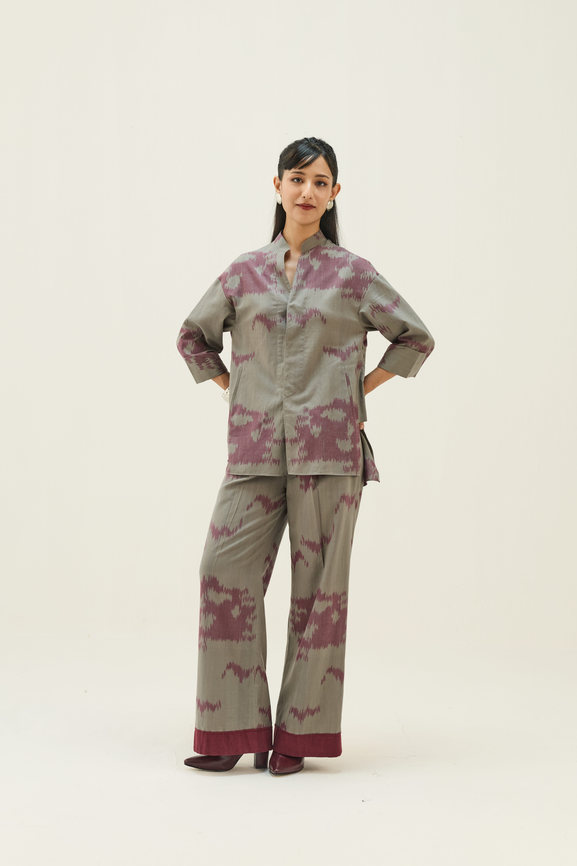 Relaxed fit, three quarter sleeve, band collared shirt that buttons at the front, crafted in an ikat fabric, where the yarns are resist-dyed with azo-free dyes then handwoven to create its pattern.