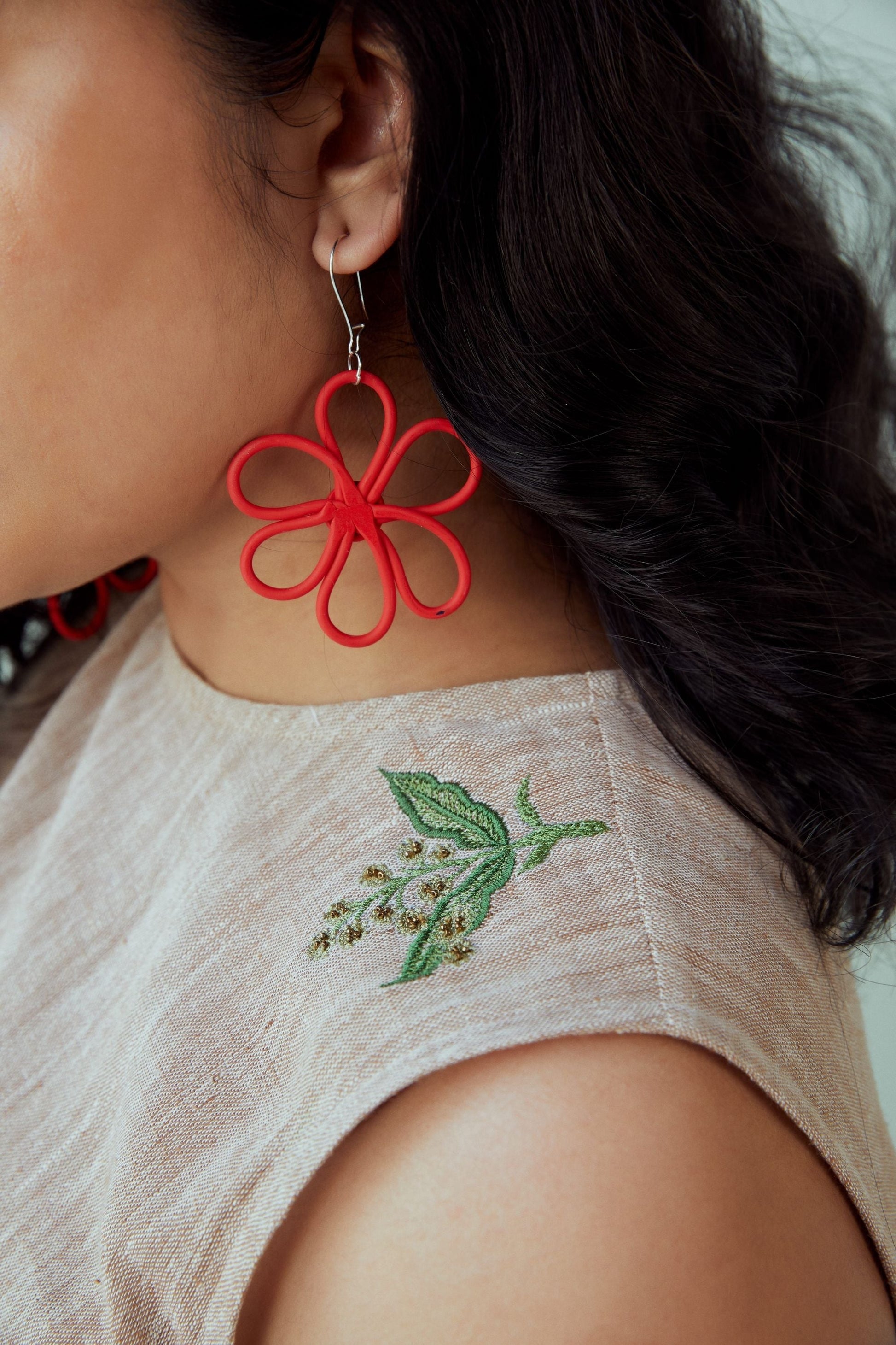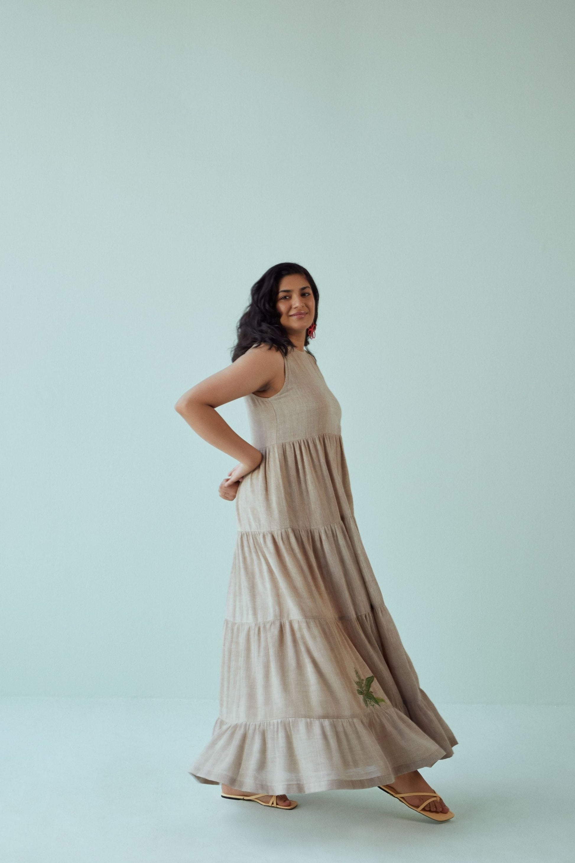 Regular fit, sleeveless, round neck, maxi dress crafted in herbal-dyed, handspun and handwoven organic cotton, machine embroidery inspired by summer flowers.
