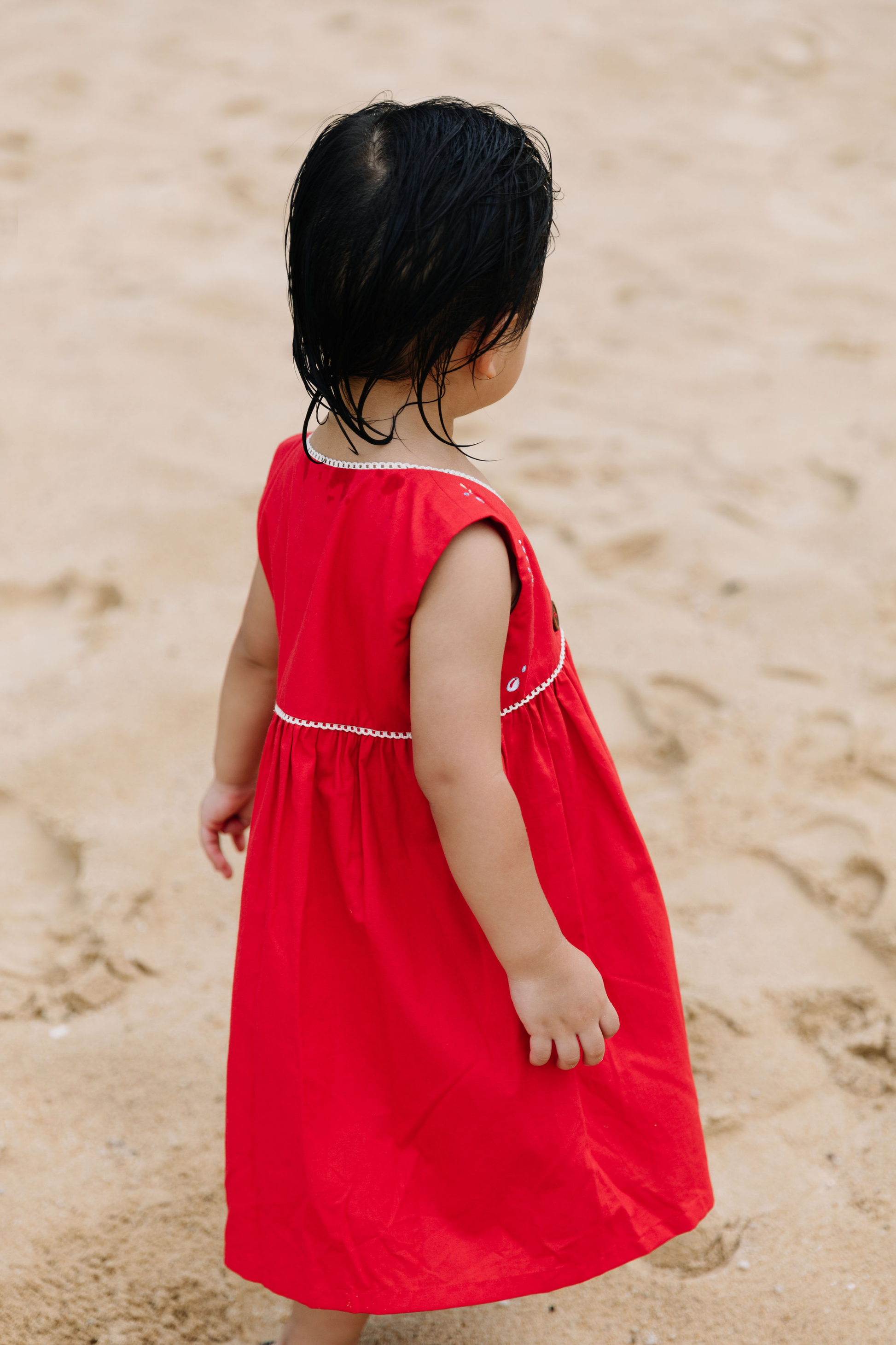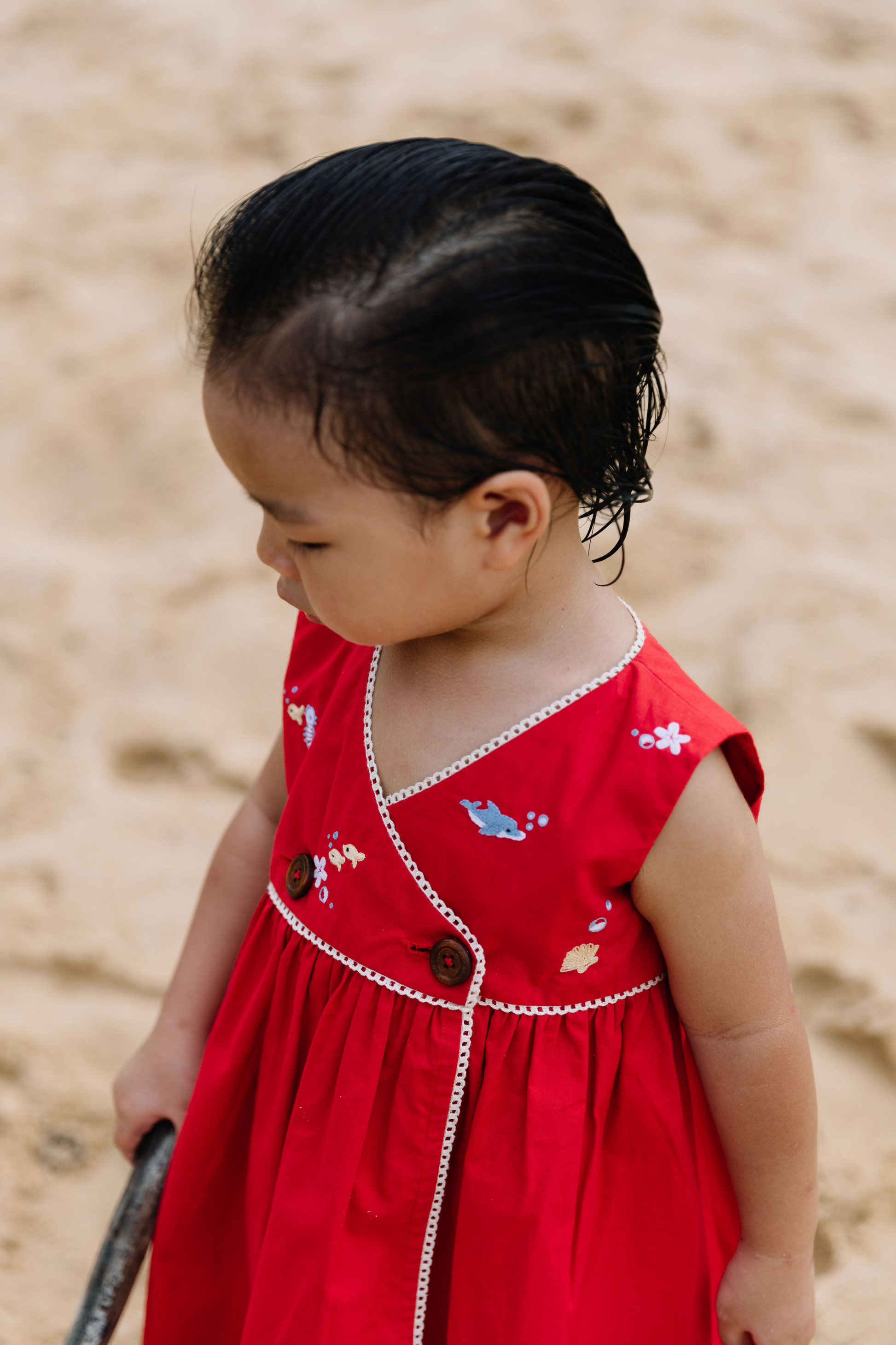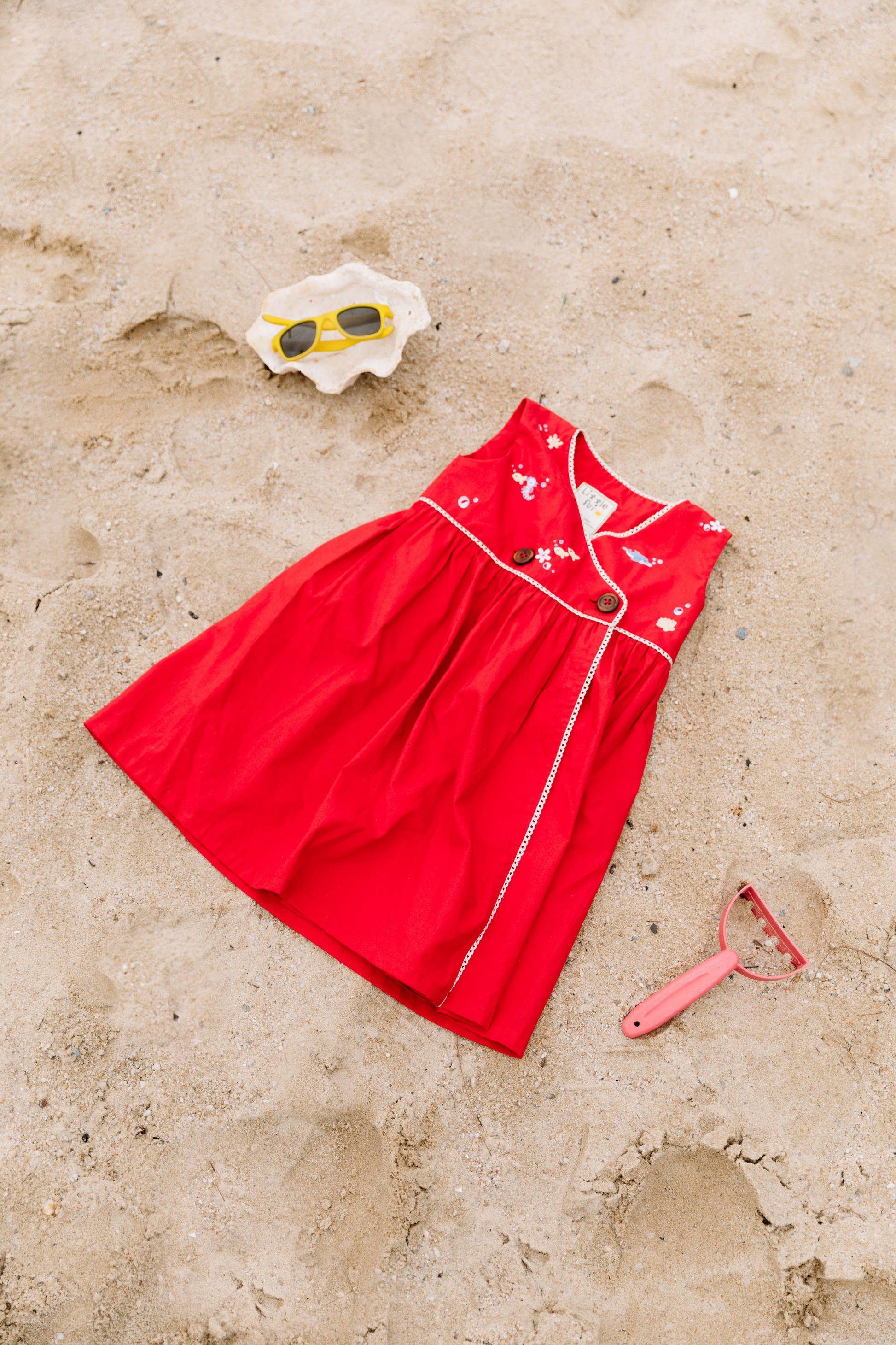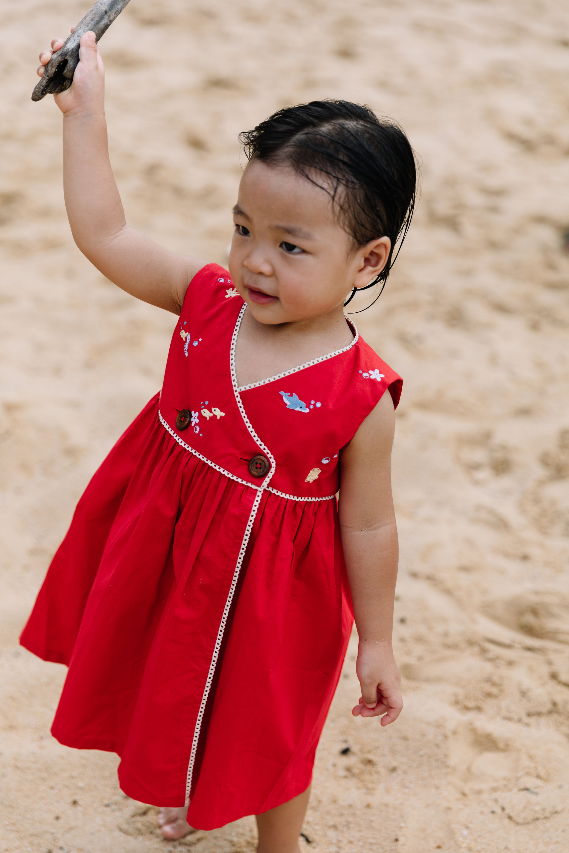 Fitted a-line, v-neck, sleeveless dress that buttons in the front, crafted in azo-free dyed organic cotton poplin fabric, hand embroidered with ocean life motifs.