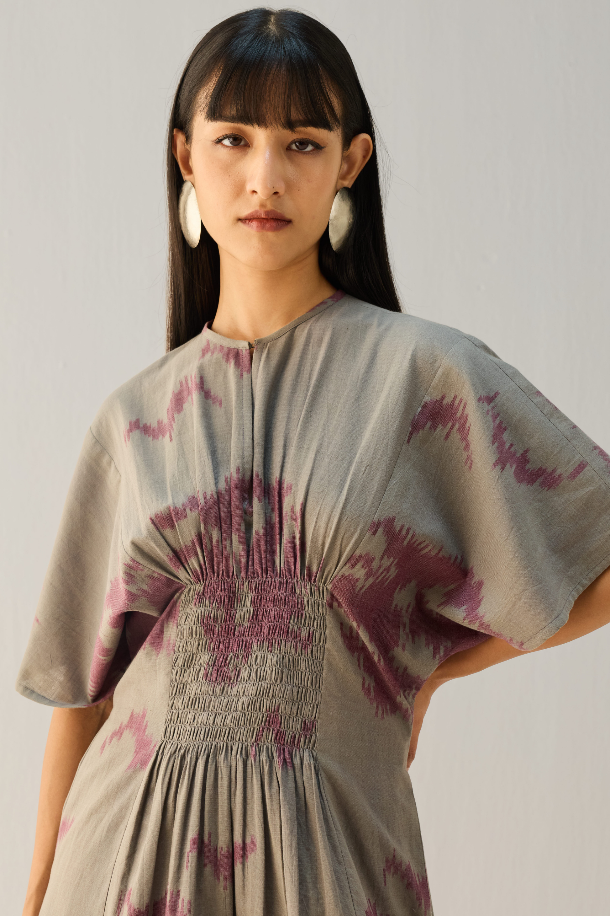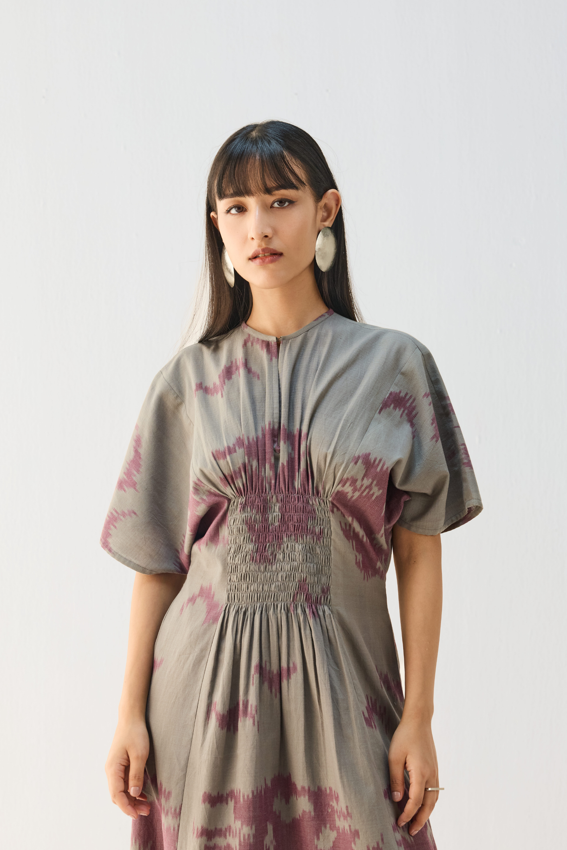 Regular fit, half sleeve, maxi dress that's smocked and fitted at the waist, crafted in an ikat fabric, the yarns are resist-dyed with azo-free dyes then handwoven to create its pattern.