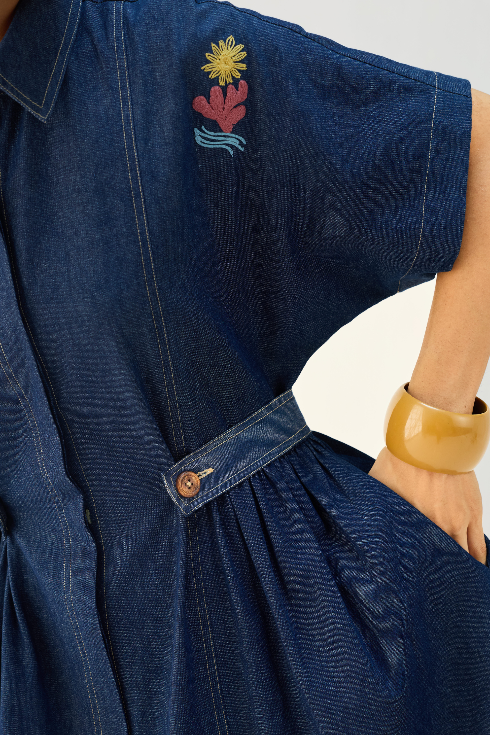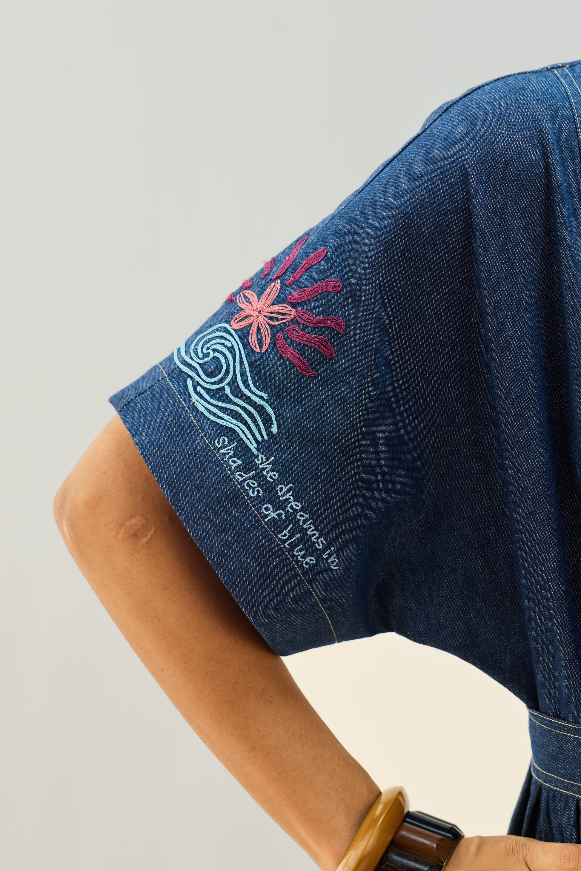 Regular fit, collared, half sleeve, midi dress that buttons at the front and is fitted at the waist with buttons, crafted in sustainable organic cotton denim fabric, hand and machine embroidered with flower and quote motifs.
