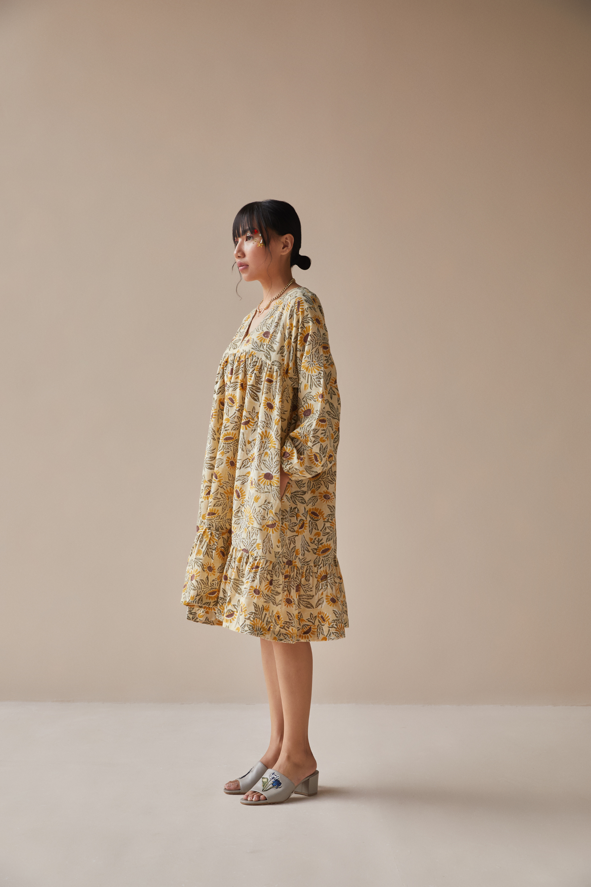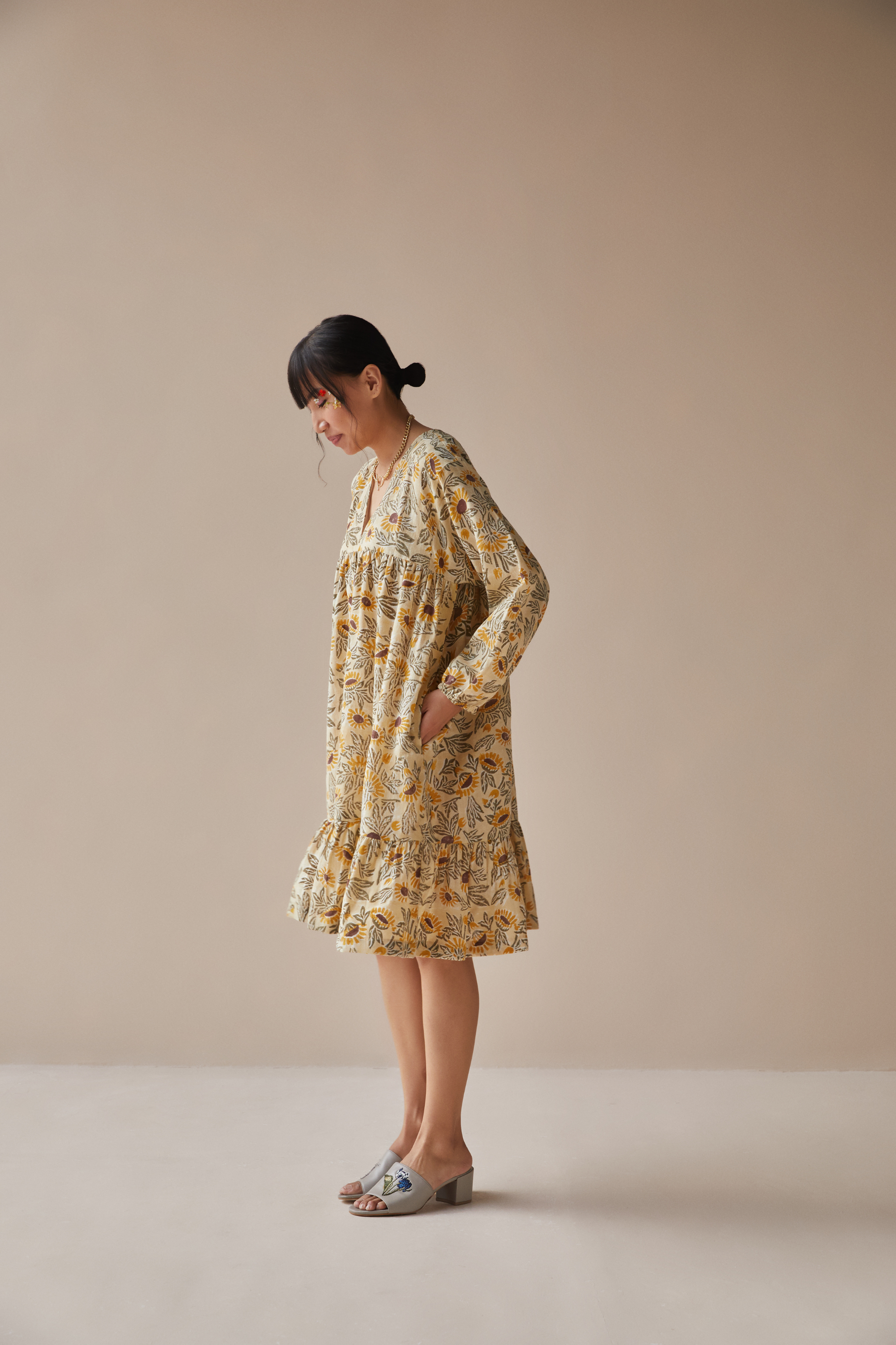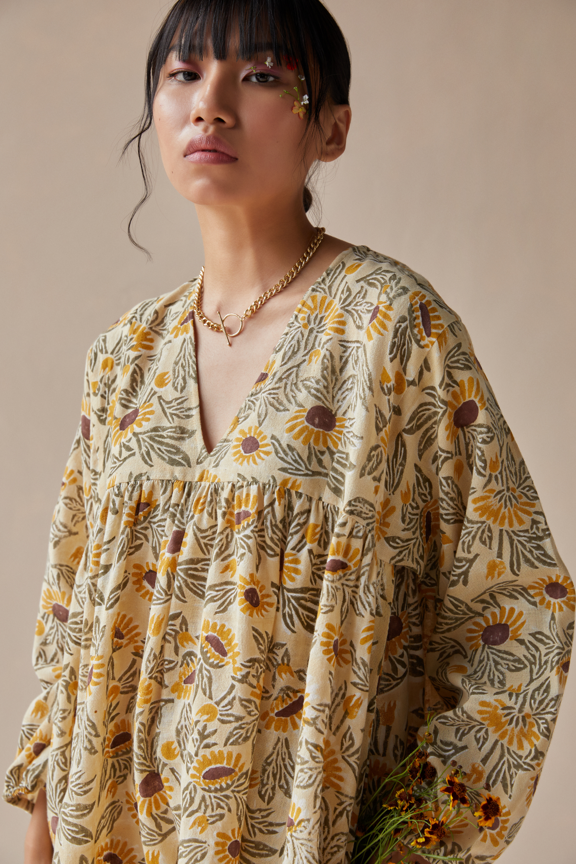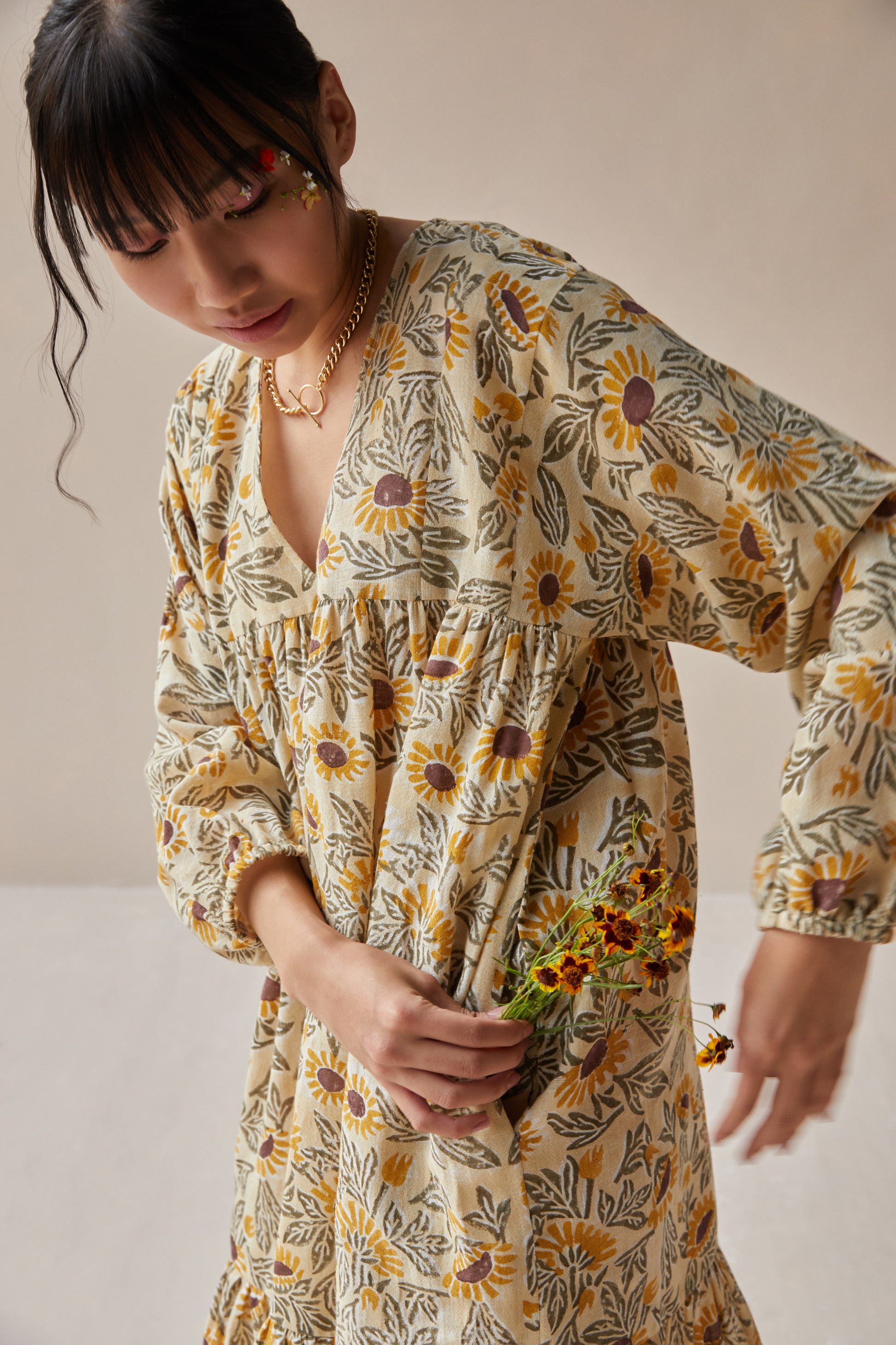 Comfortable fit, long-sleeve dress crafted in handspun and handwoven organic cotton, hand block printed with sunflower motif using azo-free dyes.