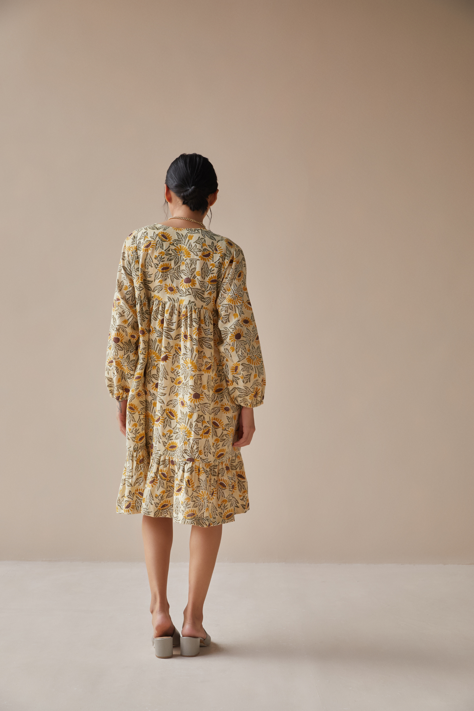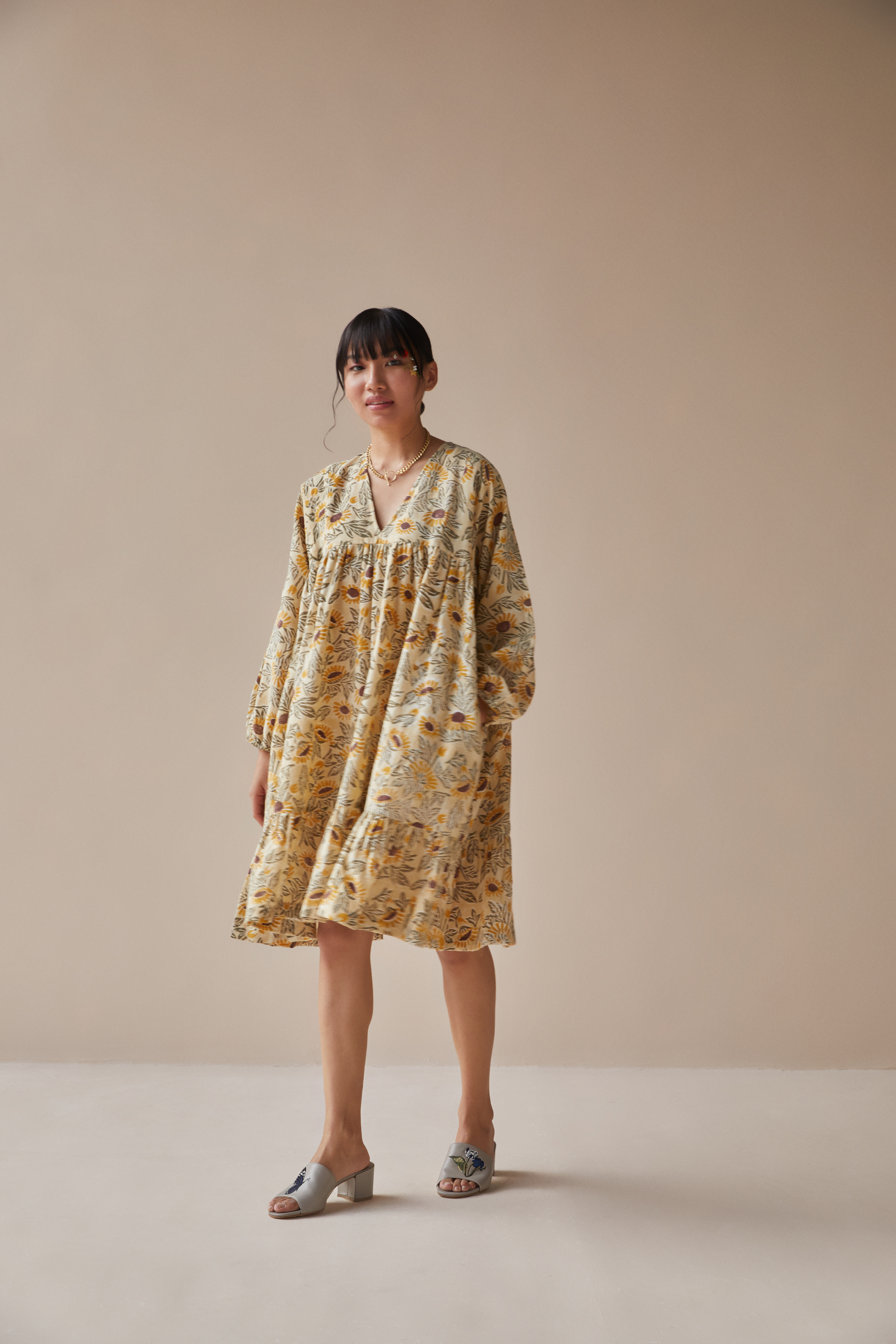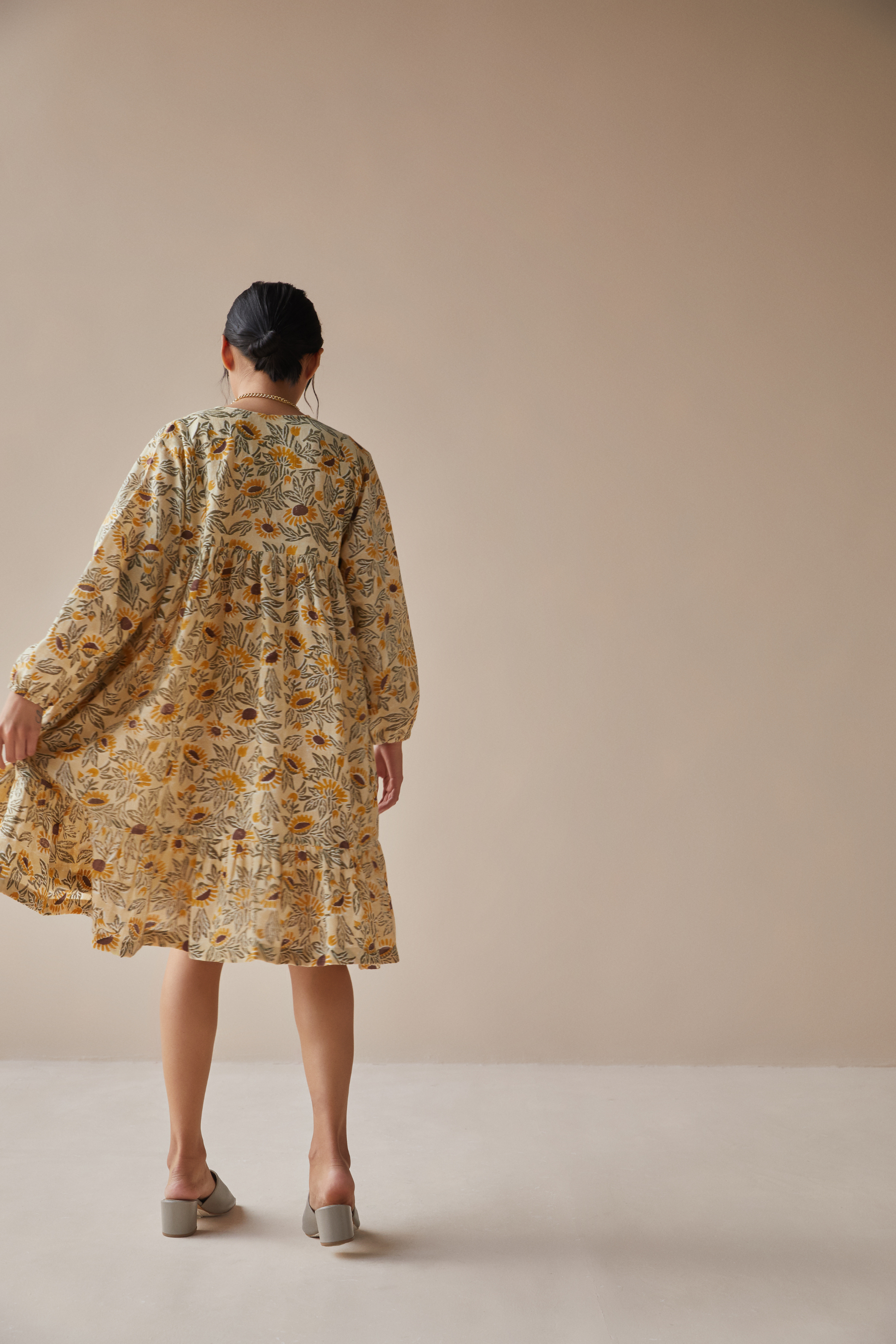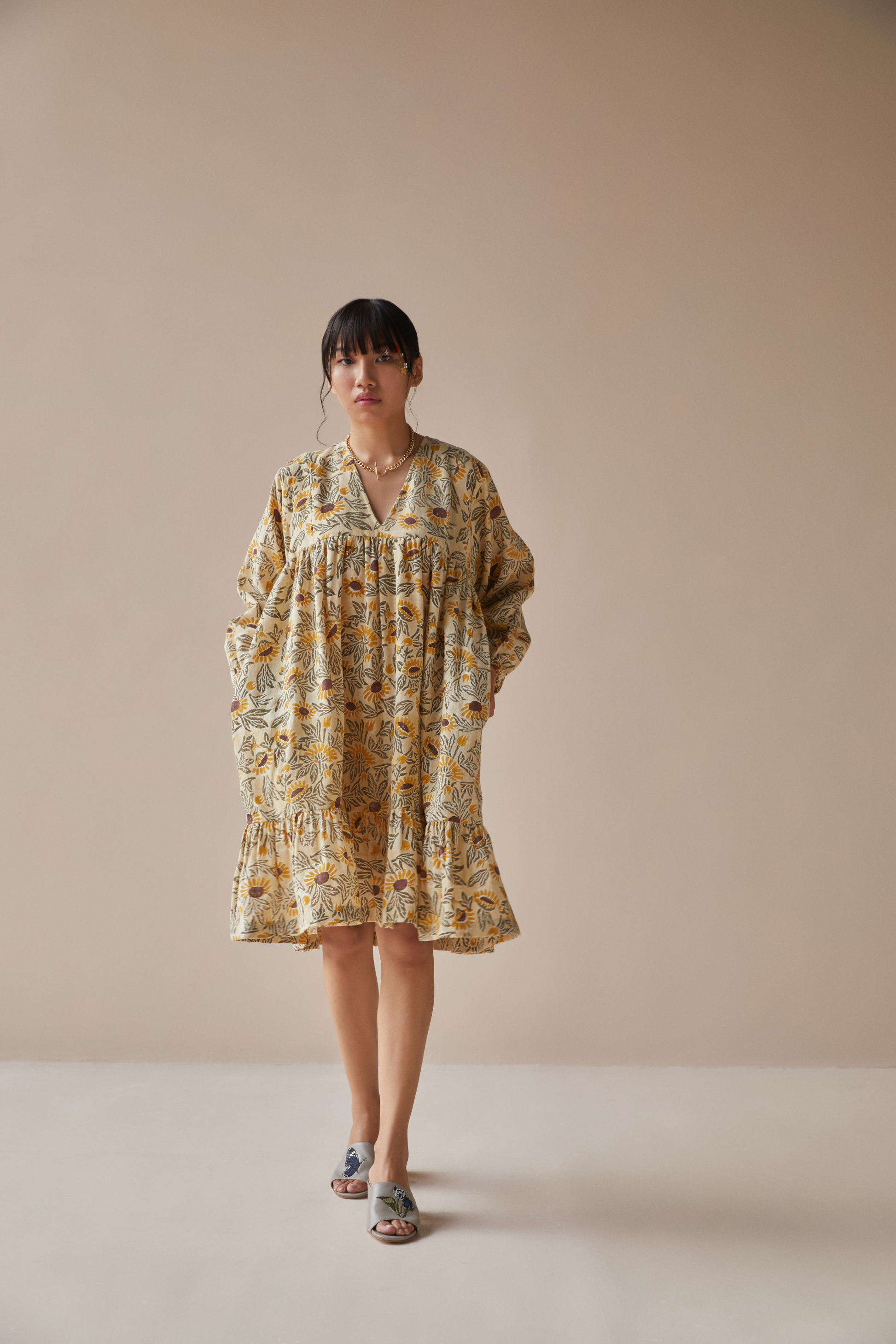 Comfortable fit, long-sleeve dress crafted in handspun and handwoven organic cotton, hand block printed with sunflower motif using azo-free dyes.