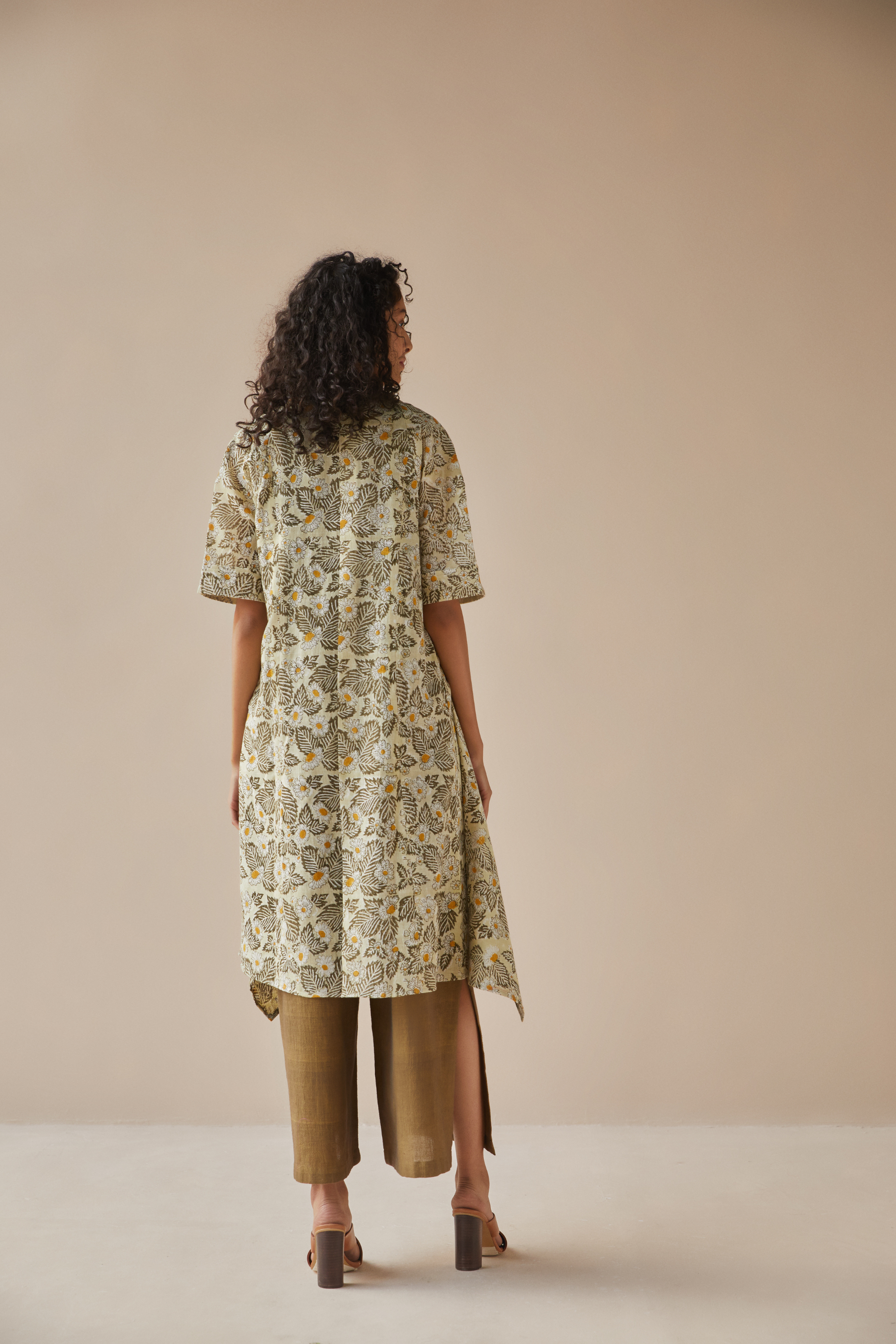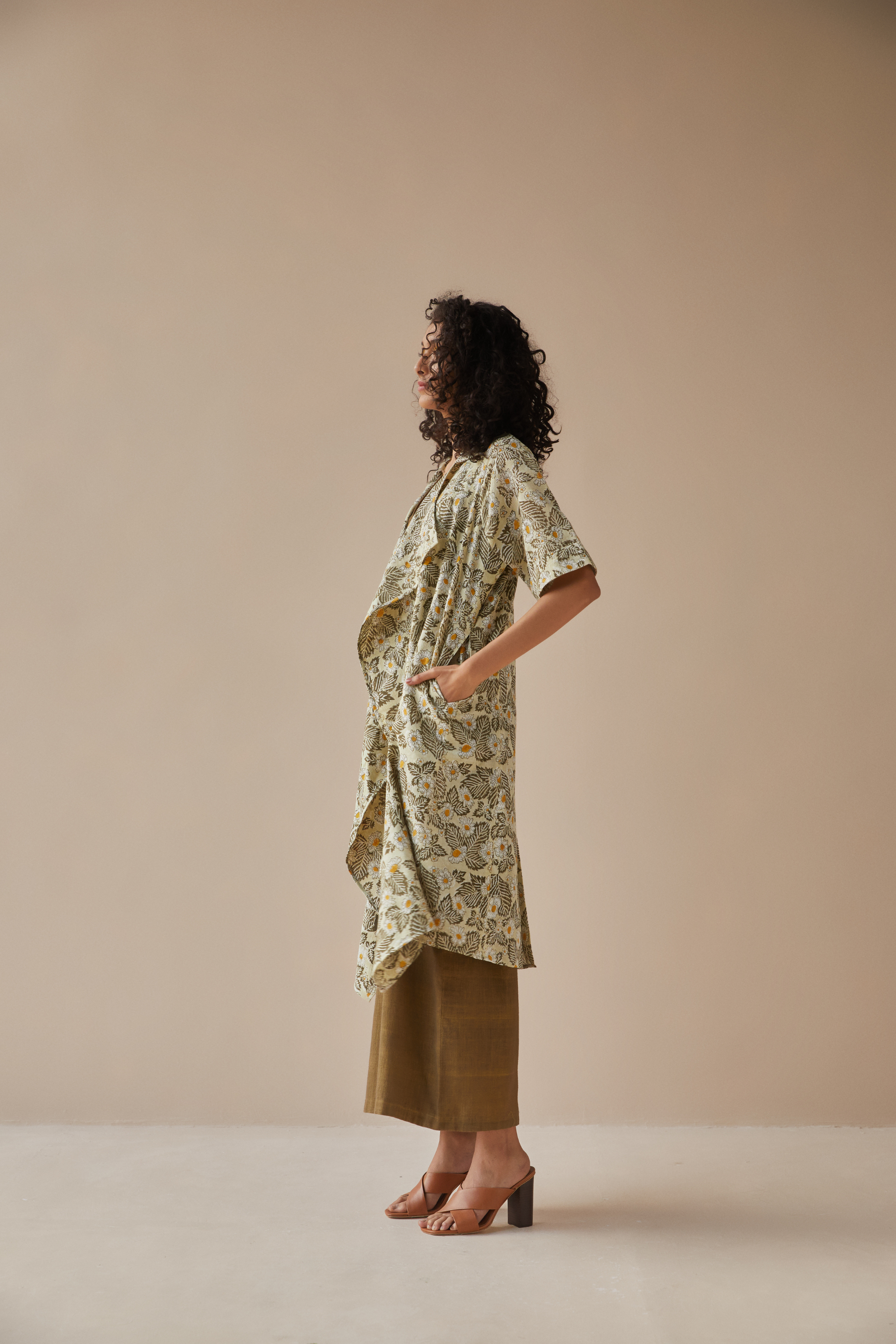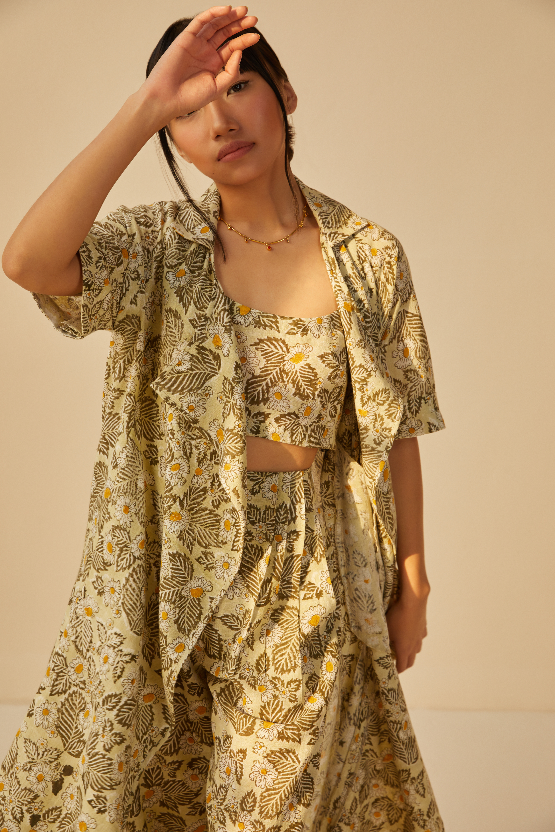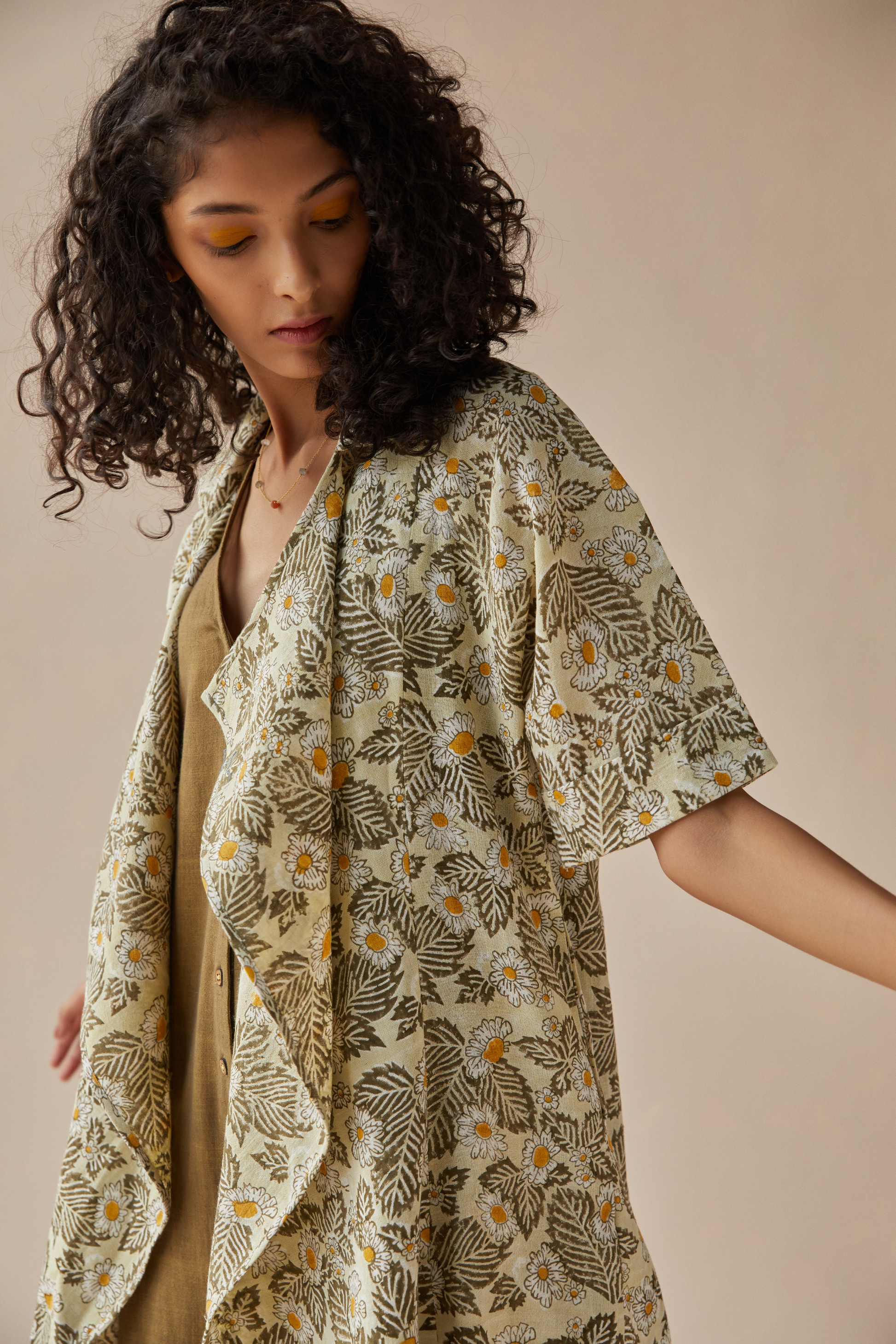 Comfortable fit, short-sleeve gilet crafted in handspun and handwoven organic cotton, hand block printed with daisy motif using azo-free dyes.