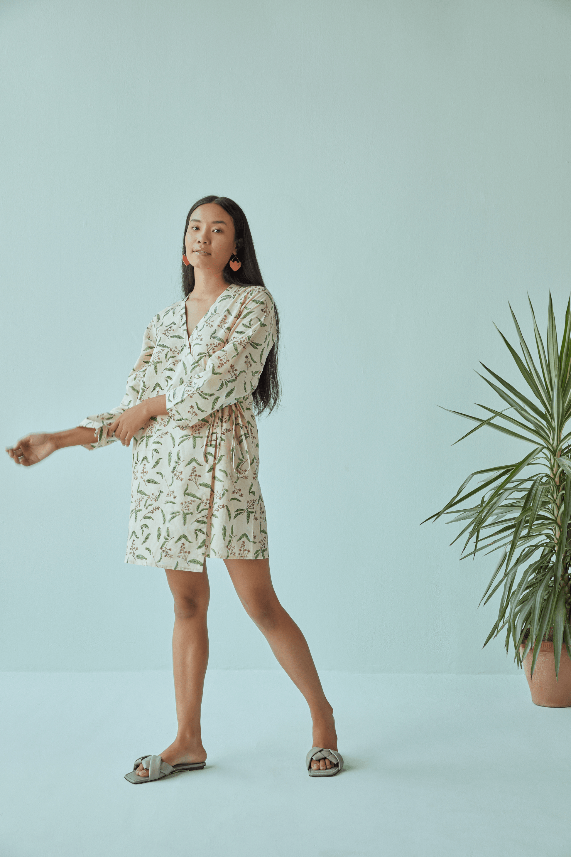 This dress is one we're loving this season, wear it on a summer day out, as a comfortable tunic with your jeans, or as a cover up to the beach! Our signature mango leaf print also shines brightly - mangoes have always been a true summer symbol for us in India, and when they come into season, that's when summer truly begins. The pulpy, yellow fruit has a history in India that dates back to several million years and was first discovered (in fossils) in north-east India, Myanmar and Bangladesh, from where it traversed a journey down south. Today, it is beloved by many of us, holding fond meOpeninges of our childhoods and bringing the excitement of balmy summer days - it was the perfect print inspiration to be designed onto many of our pieces like this one.